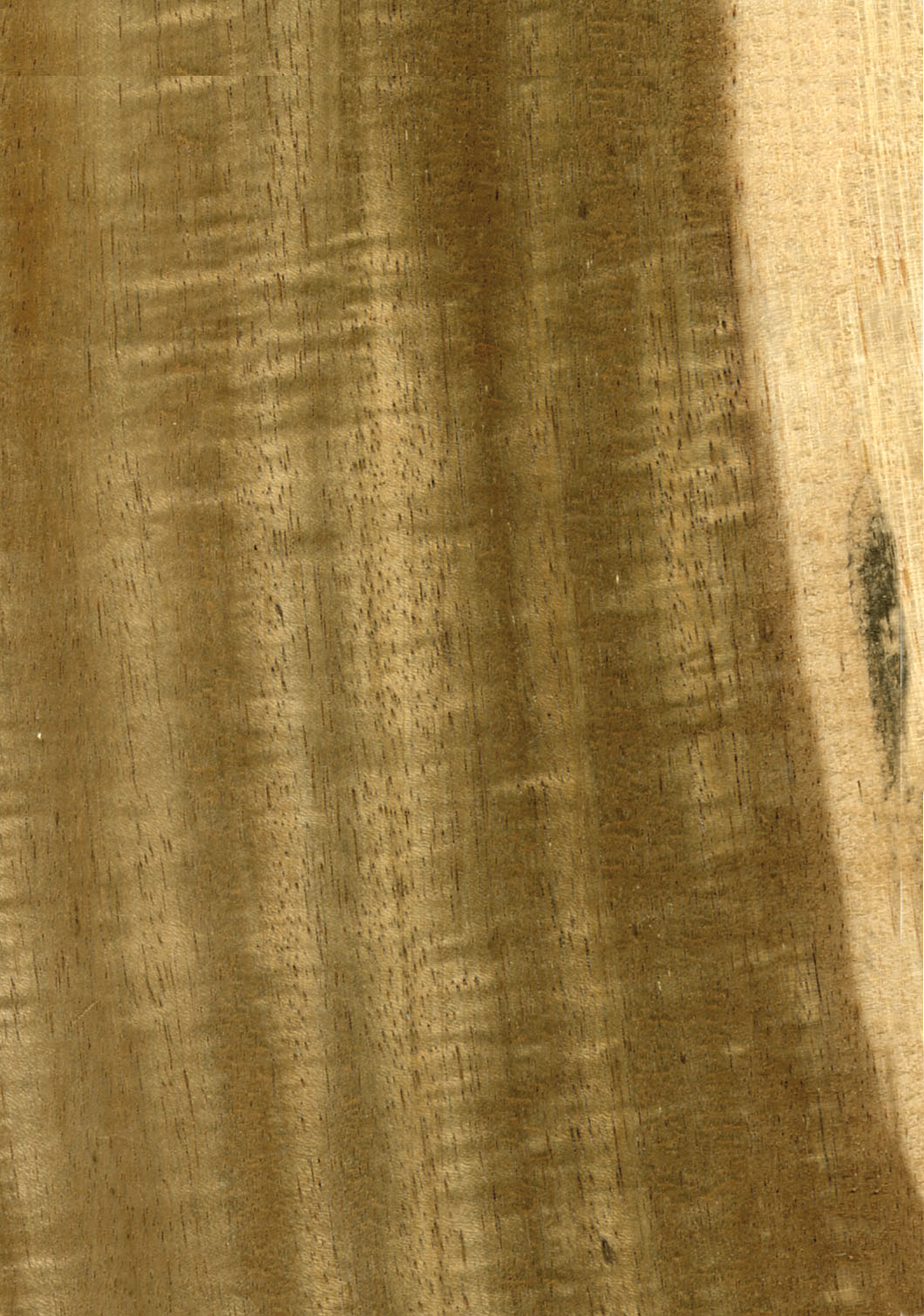 Kernholz gelblich braun bis olivbraun, oft mit leicht goldener Tönung, gelegentlich mit Farbstreifen; deutlich vom schmalen, gelblich-weißen bis strohfarbenen Splintholz abgesetzt. Zuwachszonen meist schwach markiert, Spätholz mit deutlich kleineren Poren. Speichergewebe und Holzstrahlen unauffällig. Trockenes Holz ohne charakteristischen Geruch, Faserverlauf gerade bis wechseldrehwüchsig, bei hohlkehligen Stämmen oft sehr unregelmäßig.
