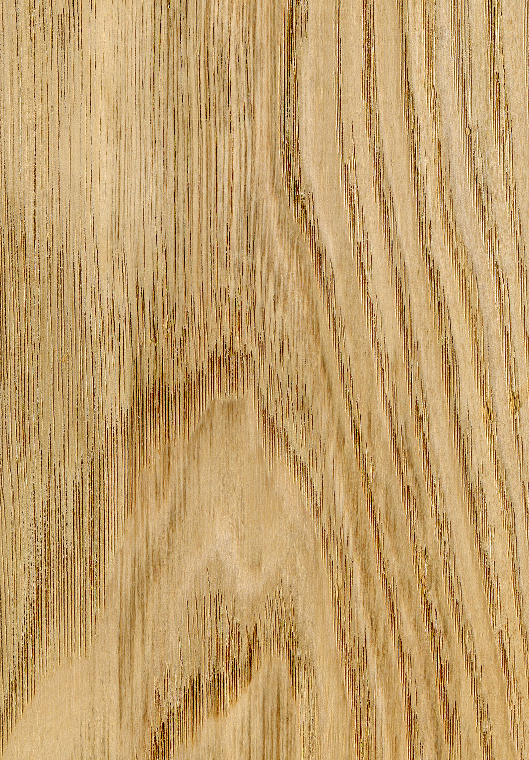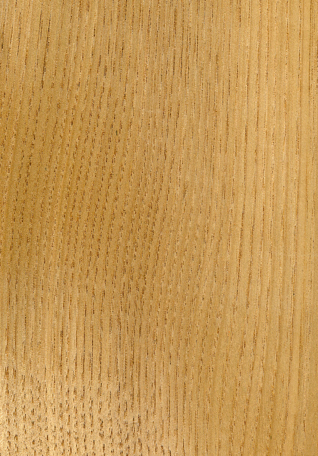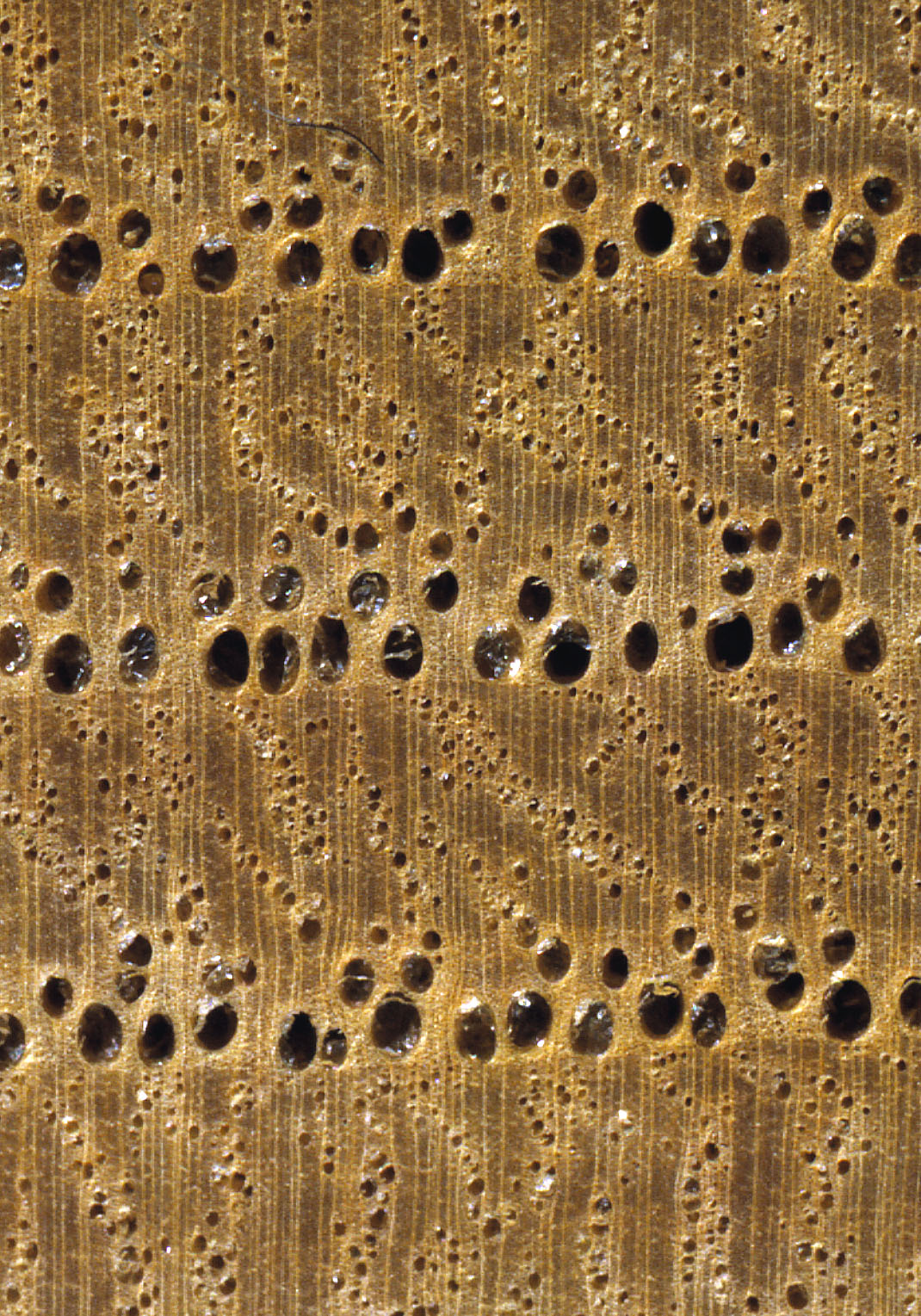 Farblich ansprechendes, durch Frühholz-Porenringe in allen Schnittrichtungen auffällig strukturiertes Holz.