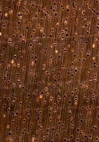 Der schmale Splint ist rosabeige bis pink und nicht immer deutlich vom rötlich braunen Kernholz abgesetzt, welches gelegentlich dunklere Farbstreifen aufweist. Zuwachszonen sind teilweise durch dichteres Fasergrundgewebe erkennbar und zudem meist durch marginale Parenchymbändchen markiert. Die Gefäße sind zerstreut, mittelgroß und sporadisch verthyllt. Der Faserverlauf ist in der Regel gerade, aber auch Wechseldrehwuchs kommt vor.