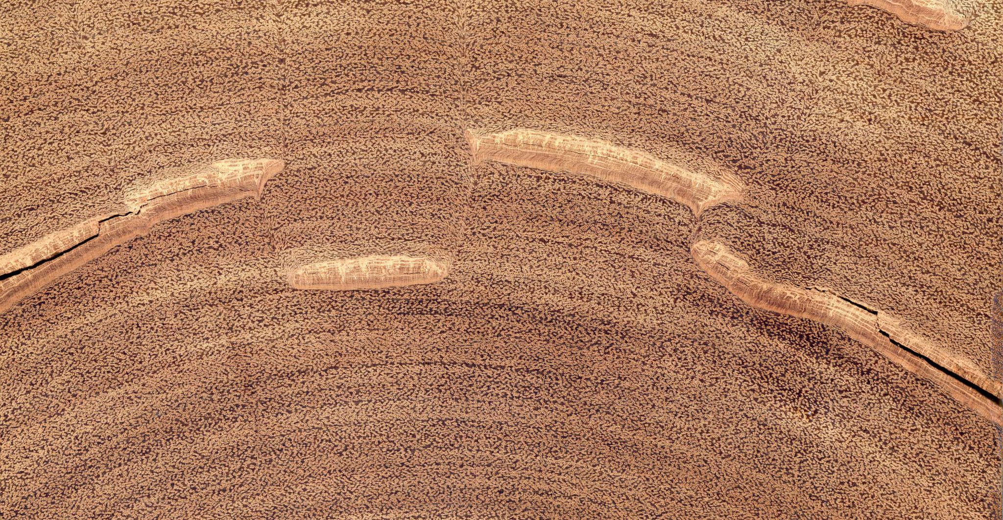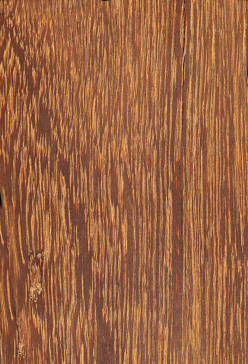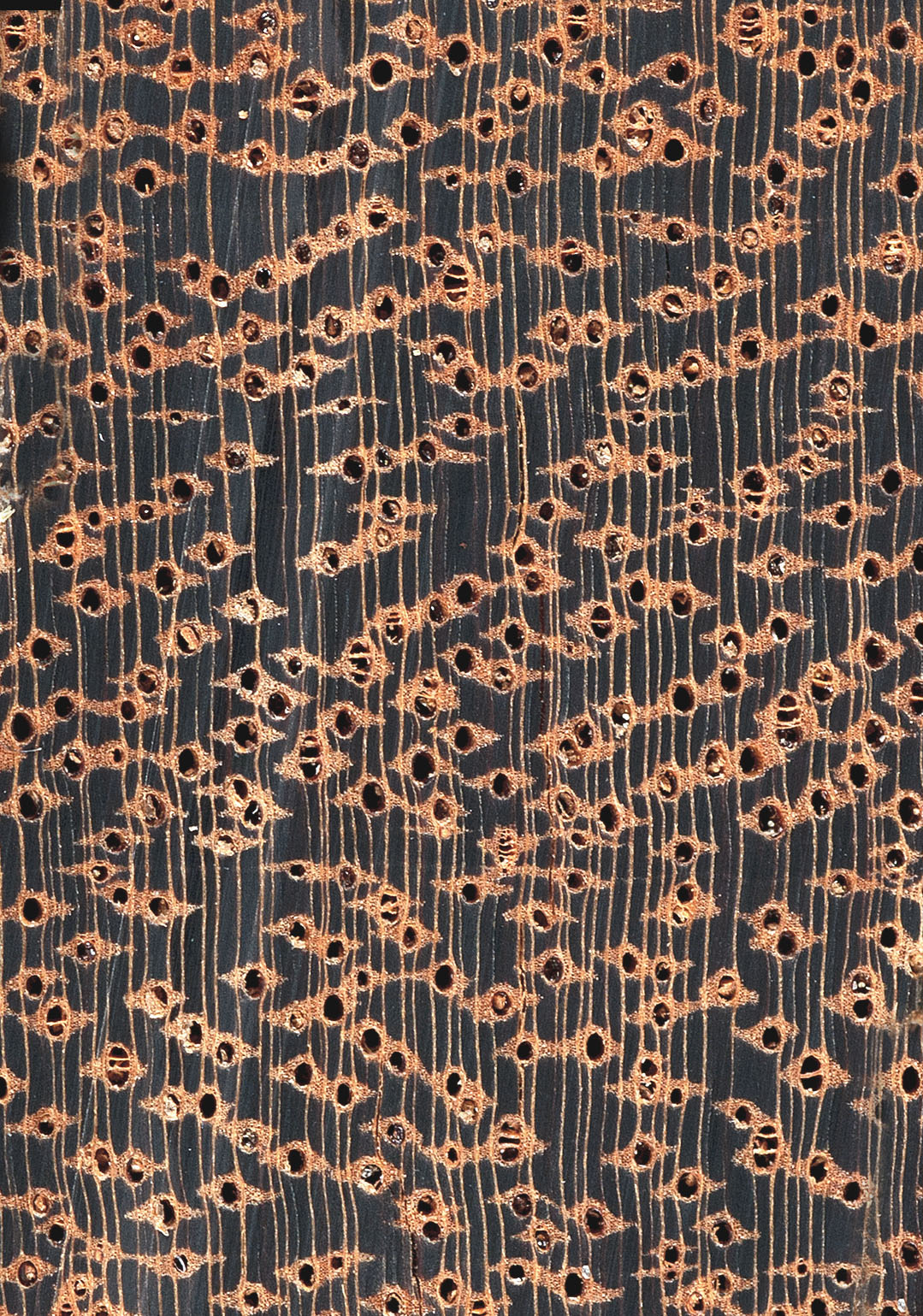 Farblich einheitliches und markant strukturiertes Holz von grober Textur, auf radialen Flächen mit deutlichen Glanzstreifen.
