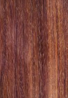 Rötlich bis violett braunes, strukturell überwiegend homogenes Holz von mittlerer Textur und sehr hoher Dichte; Holzbild schlicht, auf radialen Flächen mit schwachen Glanzstreifen durch Wechseldrehwuchs.