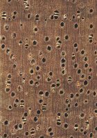 Splintholz strohfarben bis gelblich weiß, 5-8 cm breit, im frischen Zustand deutlich, im trockenen nur schwach abgesetzt vom rosa- bis gelblich braunen Kernholz, letzteres am Licht etwas nachdunkelnd. Zuwachszonen nur undeutlich durch etwas dunklere Spätholzzonen markiert. Poren sehr groß und wenig zahlreich, auf Längsfl ächen durch auff ällig dunkle und wellige Porenrillen das Holzbild wesentlich beeinfussend. Holzstrahlen sehr fein und zahlreich, in einzelnen Mustern mit unregelmäßigem Stockwerkbau. Paratracheales Axialparenchym nur spärlich entwickelt und mit bloßem Auge kaum erkennbar. Holz geradfaserig bis deutlich wechseldrehwüchsig, nur im frischen Zustand mit unangenehmem Geruch.