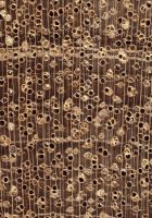 Feine Wurmlöcher von Frischholzinsekten (Befall häufig schon am stehenden Stamm) in Kern- und Splintholz, meist kleiner als 1 mm; Kurzbruchigkeit (brittle heart) im inneren Kern bei (1 .)